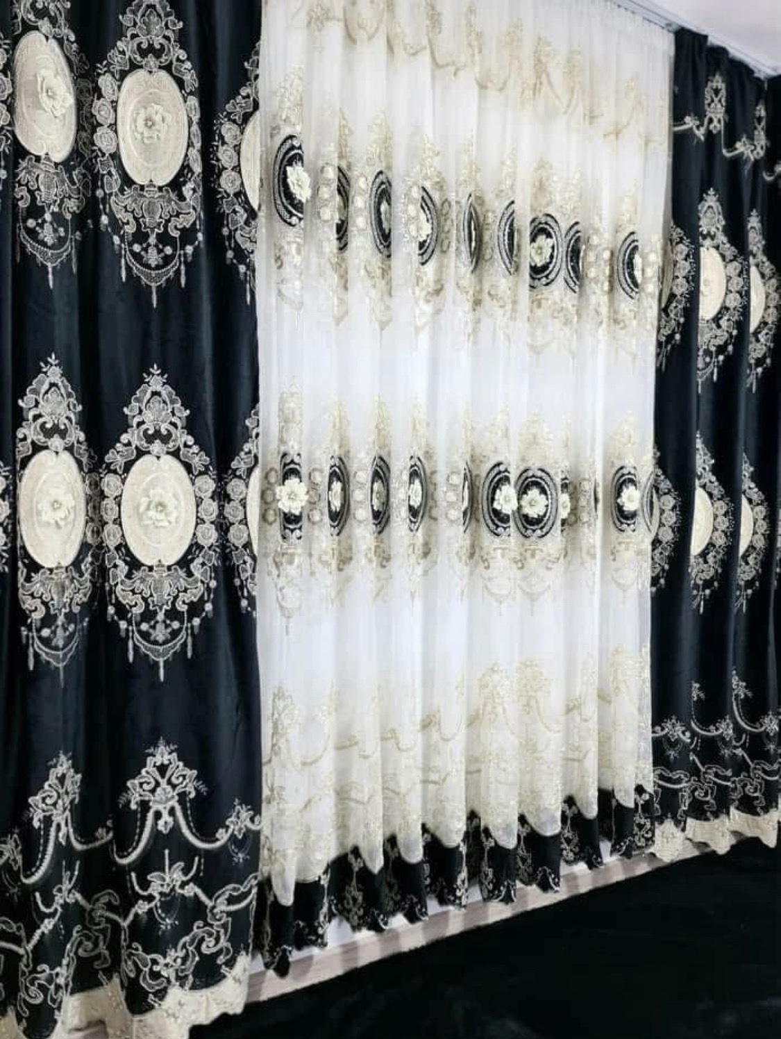 SET DRAPERIE CATIFEA 3D BRODATĂ CULOARE NEGRU CU CREM PERDEA 3D TULL BRODATĂ CULOARE CREM CU NEGRU. Cod. Produs: 7676