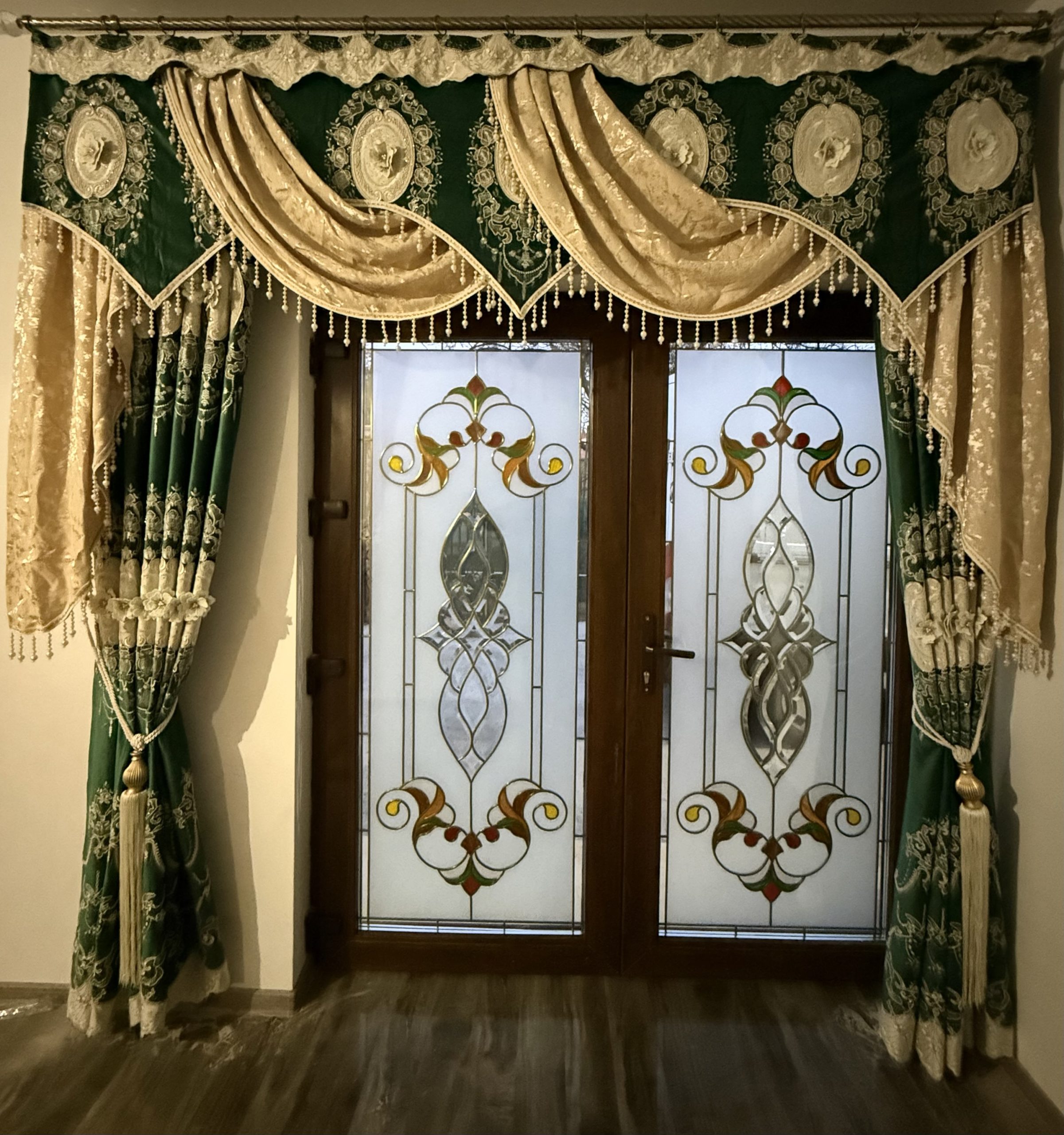 SET DRAPERIE CATIFEA 3D BRODATĂ , VERDE CU CREM. Cod Produs : 54689