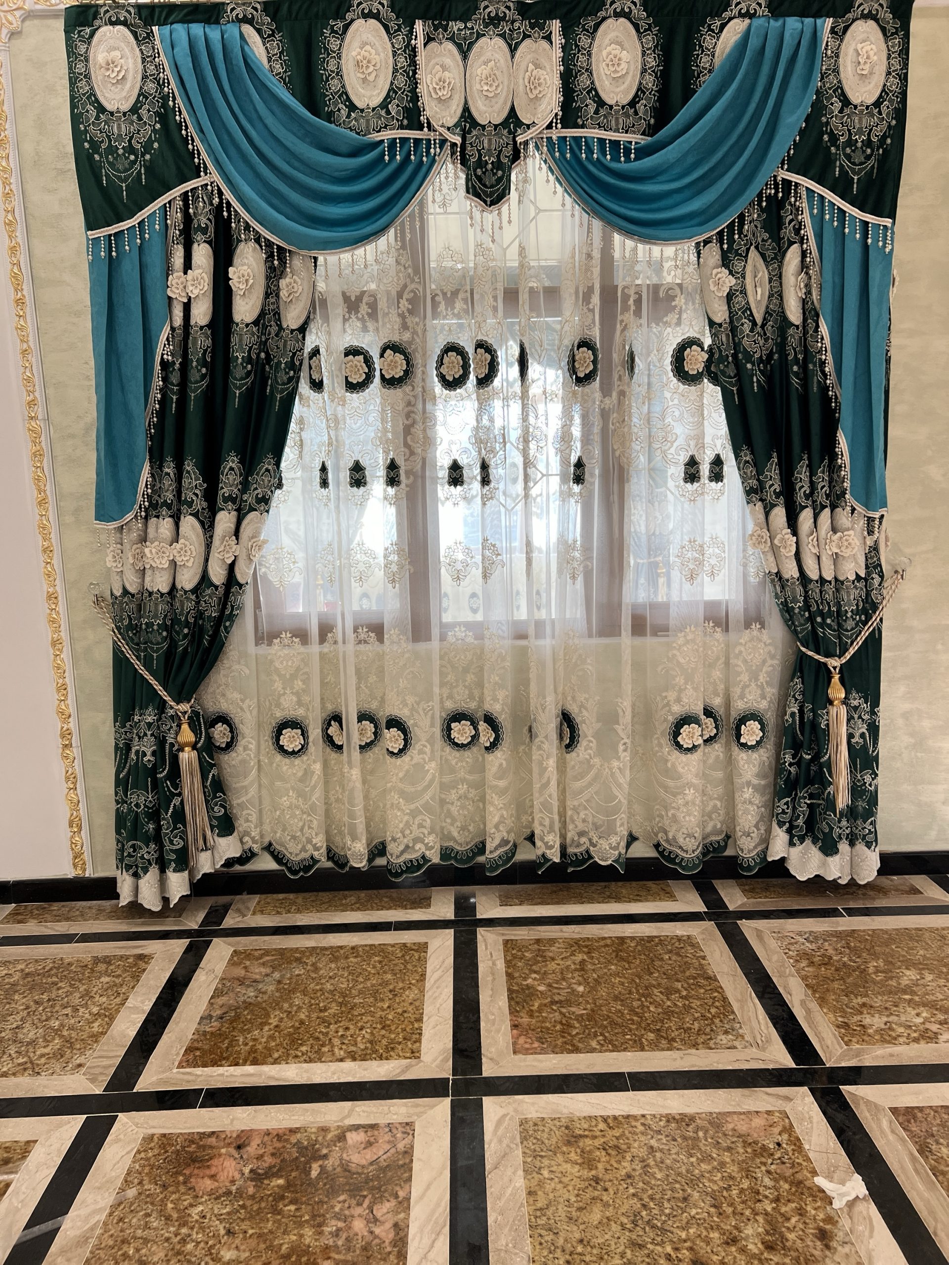 SET DRAPERIE CATIFEA 3D VERDE CU ALBASTRU, SI PERDEA 3D TULL BRODATĂ VERDE. Denumire:VESTI